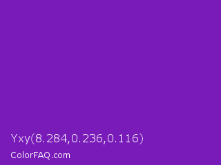Yxy 8.284,0.236,0.116 Color is a normal purple color and the nearest color is Grape #6f2da8. Hex code #781bb8 and RGB value is rgb(120,27,184). In RGB color space, this color is composed of 47% red, 11% green, 72% blue, In CMYK color space, this color is composed of 35% cyan, 85% magenta, 0% yellow , 28% black , In HSL color space, this color has a hue angle of 276° , 74% saturation and 41% lightness.