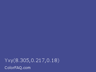 Yxy 8.305,0.217,0.18 Color is a normal blue color and the nearest color is Dark Slate Blue #483d8b. Hex code #444b91 and RGB value is rgb(68,75,145). In RGB color space, this color is composed of 27% red, 29% green, 57% blue, In CMYK color space, this color is composed of 53% cyan, 48% magenta, 0% yellow , 43% black , In HSL color space, this color has a hue angle of 235° , 36% saturation and 42% lightness.