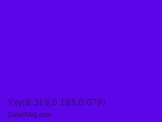 Yxy 8.319,0.183,0.079 Color is a normal violet color and the nearest color is Han Purple #5218fa. Hex code #5d05e9 and RGB value is rgb(93,5,233). In RGB color space, this color is composed of 36% red, 2% green, 91% blue, In CMYK color space, this color is composed of 60% cyan, 98% magenta, 0% yellow , 9% black , In HSL color space, this color has a hue angle of 263° , 96% saturation and 47% lightness.