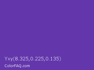 Yxy 8.325,0.225,0.135 Color is a normal violet color and the nearest color is Royal Purple #6b3fa0. Hex code #6337ab and RGB value is rgb(99,55,171). In RGB color space, this color is composed of 39% red, 22% green, 67% blue, In CMYK color space, this color is composed of 42% cyan, 68% magenta, 0% yellow , 33% black , In HSL color space, this color has a hue angle of 263° , 51% saturation and 44% lightness.