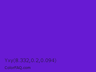 Yxy 8.332,0.2,0.094 Color is a normal violet color and the nearest color is Purple Heart Crayola #652dc1. Hex code #671ad3 and RGB value is rgb(103,26,211). In RGB color space, this color is composed of 40% red, 10% green, 83% blue, In CMYK color space, this color is composed of 51% cyan, 88% magenta, 0% yellow , 17% black , In HSL color space, this color has a hue angle of 265° , 78% saturation and 46% lightness.