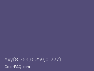 Yxy 8.364,0.259,0.227 Color is a normal indigo color and the nearest color is Purple Navy #4e5180. Hex code #534c78 and RGB value is rgb(83,76,120). In RGB color space, this color is composed of 33% red, 30% green, 47% blue, In CMYK color space, this color is composed of 31% cyan, 37% magenta, 0% yellow , 53% black , In HSL color space, this color has a hue angle of 250° , 22% saturation and 38% lightness.