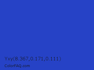 Yxy 8.367,0.171,0.111 Color is a normal blue color and the nearest color is New Car #214fc6. Hex code #2642c6 and RGB value is rgb(38,66,198). In RGB color space, this color is composed of 15% red, 26% green, 78% blue, In CMYK color space, this color is composed of 81% cyan, 67% magenta, 0% yellow , 22% black , In HSL color space, this color has a hue angle of 230° , 68% saturation and 46% lightness.