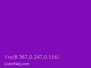 Yxy 8.367,0.247,0.116 Color is a normal purple color and the nearest color is Violet RYB #8601af. Hex code #810bb8 and RGB value is rgb(129,11,184). In RGB color space, this color is composed of 51% red, 4% green, 72% blue, In CMYK color space, this color is composed of 30% cyan, 94% magenta, 0% yellow , 28% black , In HSL color space, this color has a hue angle of 281° , 89% saturation and 38% lightness.