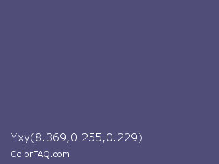 Yxy 8.369,0.255,0.229 Color is a normal indigo color and the nearest color is Purple Navy #4e5180. Hex code #504d78 and RGB value is rgb(80,77,120). In RGB color space, this color is composed of 31% red, 30% green, 47% blue, In CMYK color space, this color is composed of 33% cyan, 36% magenta, 0% yellow , 53% black , In HSL color space, this color has a hue angle of 244° , 22% saturation and 39% lightness.