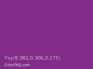 Yxy 8.382,0.306,0.175 Color is a normal magenta color and the nearest color is Vivid Violet #803790. Hex code #822c8a and RGB value is rgb(130,44,138). In RGB color space, this color is composed of 51% red, 17% green, 54% blue, In CMYK color space, this color is composed of 6% cyan, 68% magenta, 0% yellow , 46% black , In HSL color space, this color has a hue angle of 295° , 52% saturation and 36% lightness.