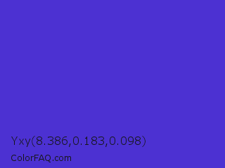 Yxy 8.386,0.183,0.098 Color is a normal indigo color and the nearest color is Purple Heart Crayola #652dc1. Hex code #4c31d2 and RGB value is rgb(76,49,210). In RGB color space, this color is composed of 30% red, 19% green, 82% blue, In CMYK color space, this color is composed of 64% cyan, 77% magenta, 0% yellow , 18% black , In HSL color space, this color has a hue angle of 250° , 64% saturation and 51% lightness.