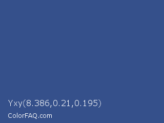 Yxy 8.386,0.21,0.195 Color is a normal blue color and the nearest color is Chambray #354e8c. Hex code #35508b and RGB value is rgb(53,80,139). In RGB color space, this color is composed of 21% red, 31% green, 55% blue, In CMYK color space, this color is composed of 62% cyan, 42% magenta, 0% yellow , 45% black , In HSL color space, this color has a hue angle of 221° , 45% saturation and 38% lightness.
