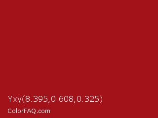 Yxy 8.395,0.608,0.325 Color is a normal red color and the nearest color is Spartan Crimson #9e1316. Hex code #a41219 and RGB value is rgb(164,18,25). In RGB color space, this color is composed of 64% red, 7% green, 10% blue, In CMYK color space, this color is composed of 0% cyan, 89% magenta, 85% yellow , 36% black , In HSL color space, this color has a hue angle of 357° , 80% saturation and 36% lightness.