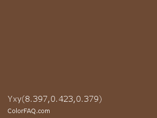 Yxy 8.397,0.423,0.379 Color is a normal orange color and the nearest color is Shingle Fawn #6b4e31. Hex code #6d4a34 and RGB value is rgb(109,74,52). In RGB color space, this color is composed of 43% red, 29% green, 20% blue, In CMYK color space, this color is composed of 0% cyan, 32% magenta, 52% yellow , 57% black , In HSL color space, this color has a hue angle of 23° , 35% saturation and 32% lightness.