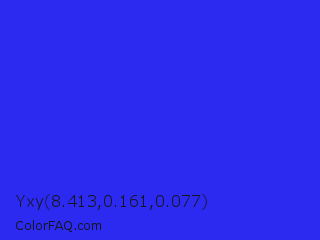Yxy 8.413,0.161,0.077 Color is a normal indigo color and the nearest color is Bluebonnet #1c1cf0. Hex code #2c29f0 and RGB value is rgb(44,41,240). In RGB color space, this color is composed of 17% red, 16% green, 94% blue, In CMYK color space, this color is composed of 82% cyan, 83% magenta, 0% yellow , 6% black , In HSL color space, this color has a hue angle of 241° , 87% saturation and 55% lightness.