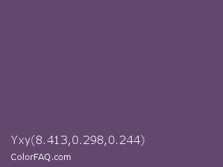 Yxy 8.413,0.298,0.244 Color is a normal purple color and the nearest color is Cyber Grape #58427c. Hex code #63486e and RGB value is rgb(99,72,110). In RGB color space, this color is composed of 39% red, 28% green, 43% blue, In CMYK color space, this color is composed of 10% cyan, 35% magenta, 0% yellow , 57% black , In HSL color space, this color has a hue angle of 283° , 21% saturation and 36% lightness.