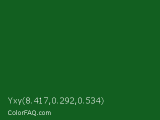 Yxy 8.417,0.292,0.534 Color is a very dark green color and the nearest color is Parsley #134f19. Hex code #125f20 and RGB value is rgb(18,95,32). In RGB color space, this color is composed of 7% red, 37% green, 13% blue, In CMYK color space, this color is composed of 81% cyan, 0% magenta, 66% yellow , 63% black , In HSL color space, this color has a hue angle of 131° , 68% saturation and 22% lightness.