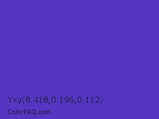 Yxy 8.418,0.196,0.112 Color is a normal indigo color and the nearest color is Ocean Blue #4f42b5. Hex code #5436c2 and RGB value is rgb(84,54,194). In RGB color space, this color is composed of 33% red, 21% green, 76% blue, In CMYK color space, this color is composed of 57% cyan, 72% magenta, 0% yellow , 24% black , In HSL color space, this color has a hue angle of 253° , 56% saturation and 49% lightness.