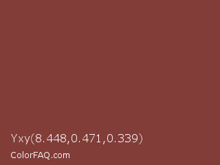 Yxy 8.448,0.471,0.339 Color is a normal red color and the nearest color is Lotus #863c3c. Hex code #833d38 and RGB value is rgb(131,61,56). In RGB color space, this color is composed of 51% red, 24% green, 22% blue, In CMYK color space, this color is composed of 0% cyan, 53% magenta, 57% yellow , 49% black , In HSL color space, this color has a hue angle of 4° , 40% saturation and 37% lightness.