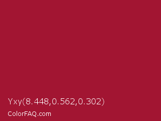 Yxy 8.448,0.562,0.302 Color is a normal red color and the nearest color is Vivid Burgundy #9f1d35. Hex code #a21532 and RGB value is rgb(162,21,50). In RGB color space, this color is composed of 64% red, 8% green, 20% blue, In CMYK color space, this color is composed of 0% cyan, 87% magenta, 69% yellow , 36% black , In HSL color space, this color has a hue angle of 348° , 77% saturation and 36% lightness.