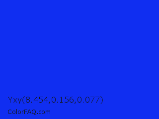 Yxy 8.454,0.156,0.077 Color is a normal blue color and the nearest color is Bluebonnet #1c1cf0. Hex code #102ef1 and RGB value is rgb(16,46,241). In RGB color space, this color is composed of 6% red, 18% green, 95% blue, In CMYK color space, this color is composed of 93% cyan, 81% magenta, 0% yellow , 5% black , In HSL color space, this color has a hue angle of 232° , 89% saturation and 50% lightness.