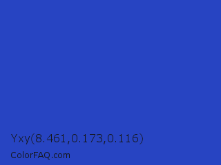 Yxy 8.461,0.173,0.116 Color is a normal blue color and the nearest color is Denim Blue #2243b6. Hex code #2744c2 and RGB value is rgb(39,68,194). In RGB color space, this color is composed of 15% red, 27% green, 76% blue, In CMYK color space, this color is composed of 80% cyan, 65% magenta, 0% yellow , 24% black , In HSL color space, this color has a hue angle of 229° , 67% saturation and 46% lightness.