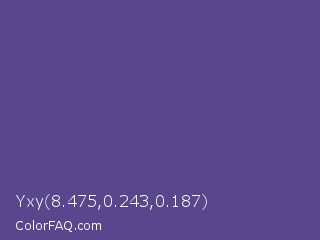 Yxy 8.475,0.243,0.187 Color is a normal indigo color and the nearest color is Victoria #534491. Hex code #58478c and RGB value is rgb(88,71,140). In RGB color space, this color is composed of 35% red, 28% green, 55% blue, In CMYK color space, this color is composed of 37% cyan, 49% magenta, 0% yellow , 45% black , In HSL color space, this color has a hue angle of 255° , 33% saturation and 41% lightness.