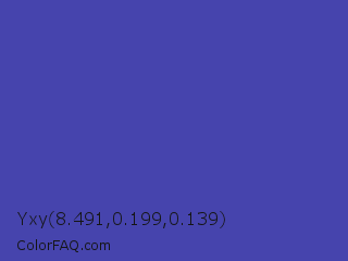 Yxy 8.491,0.199,0.139 Color is a normal indigo color and the nearest color is Ocean Blue #4f42b5. Hex code #4644ad and RGB value is rgb(70,68,173). In RGB color space, this color is composed of 27% red, 27% green, 68% blue, In CMYK color space, this color is composed of 60% cyan, 61% magenta, 0% yellow , 32% black , In HSL color space, this color has a hue angle of 241° , 44% saturation and 47% lightness.