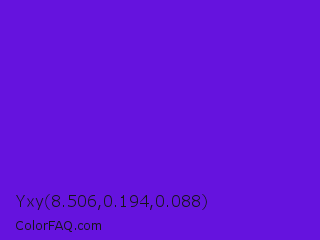 Yxy 8.506,0.194,0.088 Color is a normal violet color and the nearest color is Han Purple #5218fa. Hex code #6513de and RGB value is rgb(101,19,222). In RGB color space, this color is composed of 40% red, 7% green, 87% blue, In CMYK color space, this color is composed of 55% cyan, 91% magenta, 0% yellow , 13% black , In HSL color space, this color has a hue angle of 264° , 84% saturation and 47% lightness.