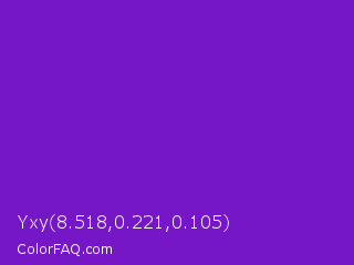 Yxy 8.518,0.221,0.105 Color is a normal purple color and the nearest color is French Violet #8806ce. Hex code #7517c7 and RGB value is rgb(117,23,199). In RGB color space, this color is composed of 46% red, 9% green, 78% blue, In CMYK color space, this color is composed of 41% cyan, 88% magenta, 0% yellow , 22% black , In HSL color space, this color has a hue angle of 272° , 79% saturation and 44% lightness.