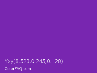 Yxy 8.523,0.245,0.128 Color is a normal purple color and the nearest color is Grape #6f2da8. Hex code #7826b0 and RGB value is rgb(120,38,176). In RGB color space, this color is composed of 47% red, 15% green, 69% blue, In CMYK color space, this color is composed of 32% cyan, 78% magenta, 0% yellow , 31% black , In HSL color space, this color has a hue angle of 276° , 64% saturation and 42% lightness.