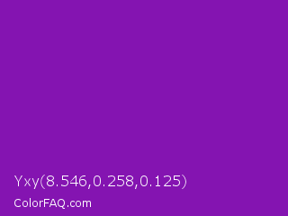 Yxy 8.546,0.258,0.125 Color is a normal purple color and the nearest color is Violet RYB #8601af. Hex code #8414b1 and RGB value is rgb(132,20,177). In RGB color space, this color is composed of 52% red, 8% green, 69% blue, In CMYK color space, this color is composed of 25% cyan, 89% magenta, 0% yellow , 31% black , In HSL color space, this color has a hue angle of 283° , 80% saturation and 39% lightness.
