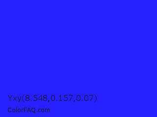 Yxy 8.548,0.157,0.07 Color is a normal indigo color and the nearest color is Bluebonnet #1c1cf0. Hex code #261ffe and RGB value is rgb(38,31,254). In RGB color space, this color is composed of 15% red, 12% green, 100% blue, In CMYK color space, this color is composed of 85% cyan, 88% magenta, 0% yellow , 0% black , In HSL color space, this color has a hue angle of 242° , 99% saturation and 56% lightness.