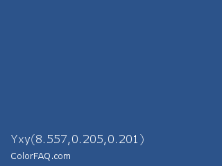 Yxy 8.557,0.205,0.201 Color is a normal blue color and the nearest color is Chambray #354e8c. Hex code #2c538a and RGB value is rgb(44,83,138). In RGB color space, this color is composed of 17% red, 33% green, 54% blue, In CMYK color space, this color is composed of 68% cyan, 40% magenta, 0% yellow , 46% black , In HSL color space, this color has a hue angle of 215° , 52% saturation and 36% lightness.
