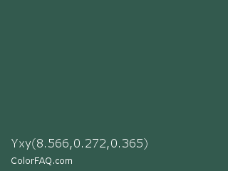Yxy 8.566,0.272,0.365 Color is a dark green color and the nearest color is Stromboli #325d52. Hex code #335a4e and RGB value is rgb(51,90,78). In RGB color space, this color is composed of 20% red, 35% green, 31% blue, In CMYK color space, this color is composed of 43% cyan, 0% magenta, 13% yellow , 65% black , In HSL color space, this color has a hue angle of 162° , 28% saturation and 28% lightness.
