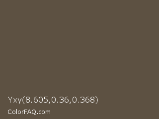 Yxy 8.605,0.36,0.368 Color is a normal orange color and the nearest color is Umber #635147. Hex code #5d5142 and RGB value is rgb(93,81,66). In RGB color space, this color is composed of 36% red, 32% green, 26% blue, In CMYK color space, this color is composed of 0% cyan, 13% magenta, 29% yellow , 64% black , In HSL color space, this color has a hue angle of 33° , 17% saturation and 31% lightness.