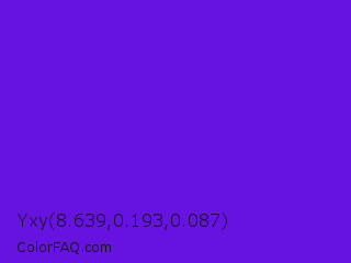 Yxy 8.639,0.193,0.087 Color is a normal violet color and the nearest color is Han Purple #5218fa. Hex code #6612e0 and RGB value is rgb(102,18,224). In RGB color space, this color is composed of 40% red, 7% green, 88% blue, In CMYK color space, this color is composed of 54% cyan, 92% magenta, 0% yellow , 12% black , In HSL color space, this color has a hue angle of 264° , 85% saturation and 47% lightness.