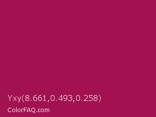 Yxy 8.661,0.493,0.258 Color is a normal rose color and the nearest color is Jazzberry Jam #a50b5e. Hex code #a21150 and RGB value is rgb(162,17,80). In RGB color space, this color is composed of 64% red, 7% green, 31% blue, In CMYK color space, this color is composed of 0% cyan, 90% magenta, 51% yellow , 36% black , In HSL color space, this color has a hue angle of 334° , 81% saturation and 35% lightness.