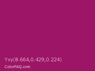 Yxy 8.664,0.429,0.224 Color is a normal magenta color and the nearest color is Jazzberry Jam #a50b5e. Hex code #9d1566 and RGB value is rgb(157,21,102). In RGB color space, this color is composed of 62% red, 8% green, 40% blue, In CMYK color space, this color is composed of 0% cyan, 87% magenta, 35% yellow , 38% black , In HSL color space, this color has a hue angle of 324° , 76% saturation and 35% lightness.