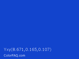 Yxy 8.671,0.165,0.107 Color is a normal blue color and the nearest color is New Car #214fc6. Hex code #1244cd and RGB value is rgb(18,68,205). In RGB color space, this color is composed of 7% red, 27% green, 80% blue, In CMYK color space, this color is composed of 91% cyan, 67% magenta, 0% yellow , 20% black , In HSL color space, this color has a hue angle of 224° , 84% saturation and 44% lightness.