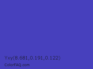 Yxy 8.681,0.191,0.122 Color is a normal indigo color and the nearest color is Ocean Blue #4f42b5. Hex code #4740bd and RGB value is rgb(71,64,189). In RGB color space, this color is composed of 28% red, 25% green, 74% blue, In CMYK color space, this color is composed of 62% cyan, 66% magenta, 0% yellow , 26% black , In HSL color space, this color has a hue angle of 243° , 49% saturation and 50% lightness.