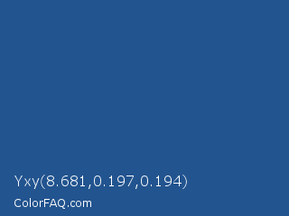 Yxy 8.681,0.197,0.194 Color is a normal blue color and the nearest color is B Dazzled Blue #2e5894. Hex code #22548f and RGB value is rgb(34,84,143). In RGB color space, this color is composed of 13% red, 33% green, 56% blue, In CMYK color space, this color is composed of 76% cyan, 41% magenta, 0% yellow , 44% black , In HSL color space, this color has a hue angle of 212° , 62% saturation and 35% lightness.