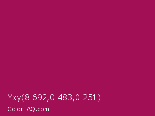 Yxy 8.692,0.483,0.251 Color is a normal rose color and the nearest color is Jazzberry Jam #a50b5e. Hex code #a20f54 and RGB value is rgb(162,15,84). In RGB color space, this color is composed of 64% red, 6% green, 33% blue, In CMYK color space, this color is composed of 0% cyan, 91% magenta, 48% yellow , 36% black , In HSL color space, this color has a hue angle of 332° , 83% saturation and 35% lightness.
