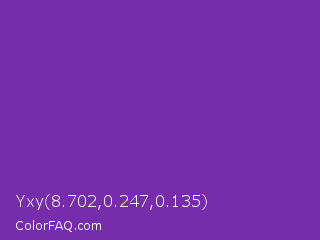 Yxy 8.702,0.247,0.135 Color is a normal purple color and the nearest color is Grape #6f2da8. Hex code #772cac and RGB value is rgb(119,44,172). In RGB color space, this color is composed of 47% red, 17% green, 67% blue, In CMYK color space, this color is composed of 31% cyan, 74% magenta, 0% yellow , 33% black , In HSL color space, this color has a hue angle of 275° , 59% saturation and 42% lightness.