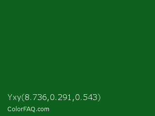 Yxy 8.736,0.291,0.543 Color is a very dark green color and the nearest color is Camarone #00581a. Hex code #0d611e and RGB value is rgb(13,97,30). In RGB color space, this color is composed of 5% red, 38% green, 12% blue, In CMYK color space, this color is composed of 87% cyan, 0% magenta, 69% yellow , 62% black , In HSL color space, this color has a hue angle of 132° , 76% saturation and 22% lightness.