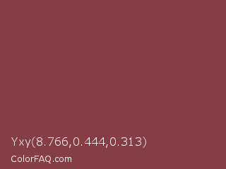Yxy 8.766,0.444,0.313 Color is a normal red color and the nearest color is Cordovan #893f45. Hex code #853d46 and RGB value is rgb(133,61,70). In RGB color space, this color is composed of 52% red, 24% green, 27% blue, In CMYK color space, this color is composed of 0% cyan, 54% magenta, 47% yellow , 48% black , In HSL color space, this color has a hue angle of 353° , 37% saturation and 38% lightness.
