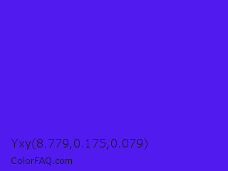 Yxy 8.779,0.175,0.079 Color is a normal indigo color and the nearest color is Han Purple #5218fa. Hex code #511bf0 and RGB value is rgb(81,27,240). In RGB color space, this color is composed of 32% red, 11% green, 94% blue, In CMYK color space, this color is composed of 66% cyan, 89% magenta, 0% yellow , 6% black , In HSL color space, this color has a hue angle of 255° , 88% saturation and 52% lightness.