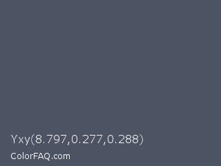Yxy 8.797,0.277,0.288 Color is a normal blue color and the nearest color is Independence #4c516d. Hex code #4c5464 and RGB value is rgb(76,84,100). In RGB color space, this color is composed of 30% red, 33% green, 39% blue, In CMYK color space, this color is composed of 24% cyan, 16% magenta, 0% yellow , 61% black , In HSL color space, this color has a hue angle of 220° , 14% saturation and 35% lightness.