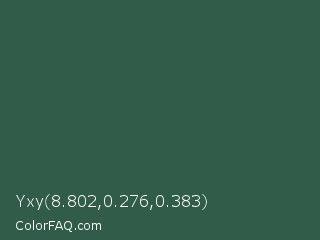 Yxy 8.802,0.276,0.383 Color is a dark green color and the nearest color is Stromboli #325d52. Hex code #315c4a and RGB value is rgb(49,92,74). In RGB color space, this color is composed of 19% red, 36% green, 29% blue, In CMYK color space, this color is composed of 47% cyan, 0% magenta, 20% yellow , 64% black , In HSL color space, this color has a hue angle of 155° , 30% saturation and 28% lightness.