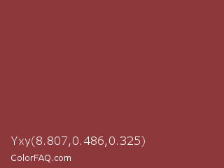 Yxy 8.807,0.486,0.325 Color is a normal red color and the nearest color is Sanguine Brown #8d3d38. Hex code #8d383b and RGB value is rgb(141,56,59). In RGB color space, this color is composed of 55% red, 22% green, 23% blue, In CMYK color space, this color is composed of 0% cyan, 60% magenta, 58% yellow , 45% black , In HSL color space, this color has a hue angle of 358° , 43% saturation and 39% lightness.