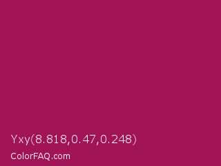 Yxy 8.818,0.47,0.248 Color is a normal rose color and the nearest color is Jazzberry Jam #a50b5e. Hex code #a11558 and RGB value is rgb(161,21,88). In RGB color space, this color is composed of 63% red, 8% green, 35% blue, In CMYK color space, this color is composed of 0% cyan, 87% magenta, 45% yellow , 37% black , In HSL color space, this color has a hue angle of 331° , 77% saturation and 36% lightness.