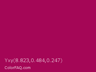 Yxy 8.823,0.484,0.247 Color is a normal rose color and the nearest color is Jazzberry Jam #a50b5e. Hex code #a50656 and RGB value is rgb(165,6,86). In RGB color space, this color is composed of 65% red, 2% green, 34% blue, In CMYK color space, this color is composed of 0% cyan, 96% magenta, 48% yellow , 35% black , In HSL color space, this color has a hue angle of 330° , 93% saturation and 34% lightness.