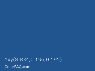 Yxy 8.834,0.196,0.195 Color is a normal blue color and the nearest color is Cyan Cobalt Blue #28589c. Hex code #205590 and RGB value is rgb(32,85,144). In RGB color space, this color is composed of 13% red, 33% green, 56% blue, In CMYK color space, this color is composed of 78% cyan, 41% magenta, 0% yellow , 44% black , In HSL color space, this color has a hue angle of 212° , 64% saturation and 35% lightness.