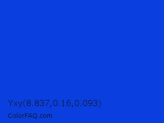 Yxy 8.837,0.16,0.093 Color is a normal blue color and the nearest color is Palatinate Blue #273be2. Hex code #0a3edf and RGB value is rgb(10,62,223). In RGB color space, this color is composed of 4% red, 24% green, 87% blue, In CMYK color space, this color is composed of 96% cyan, 72% magenta, 0% yellow , 13% black , In HSL color space, this color has a hue angle of 225° , 91% saturation and 46% lightness.